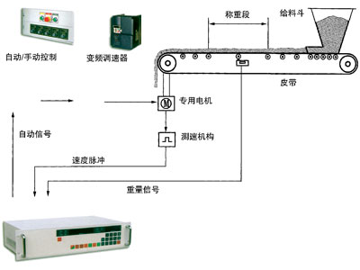 來自皮帶上物料的重量信號和皮帶運行的速度信號被一同傳到HL500B(一機一路DCS接口)或PL3000(一機十六路)測量和控制系統(tǒng)中(HL500B和PL3000內(nèi)部均以微處理為核心)。通過連續(xù)不斷的比較設(shè)定值與皮帶實際輸送的物料重量,不停的調(diào)節(jié)皮帶運行的速度。因此,使用物料流量總能穩(wěn)定在設(shè)定值上。